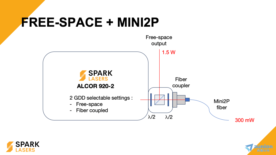 ALCOR也可提供自由可見光輸出+Mini2P光纖輸出的模式,為雙光子成像系統(tǒng)提供更多自由度。